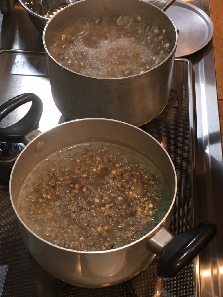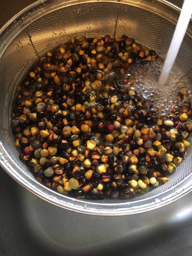 今回は2色のトルティーヤを作りたかったので、はずしたトウモロコシの実を濃い色の実と薄い色の実に分けて洗い、木灰とホタテの貝殻を粉末にしたものを入れて煮ます。煮終わったら、そのまま一晩寝かせます。