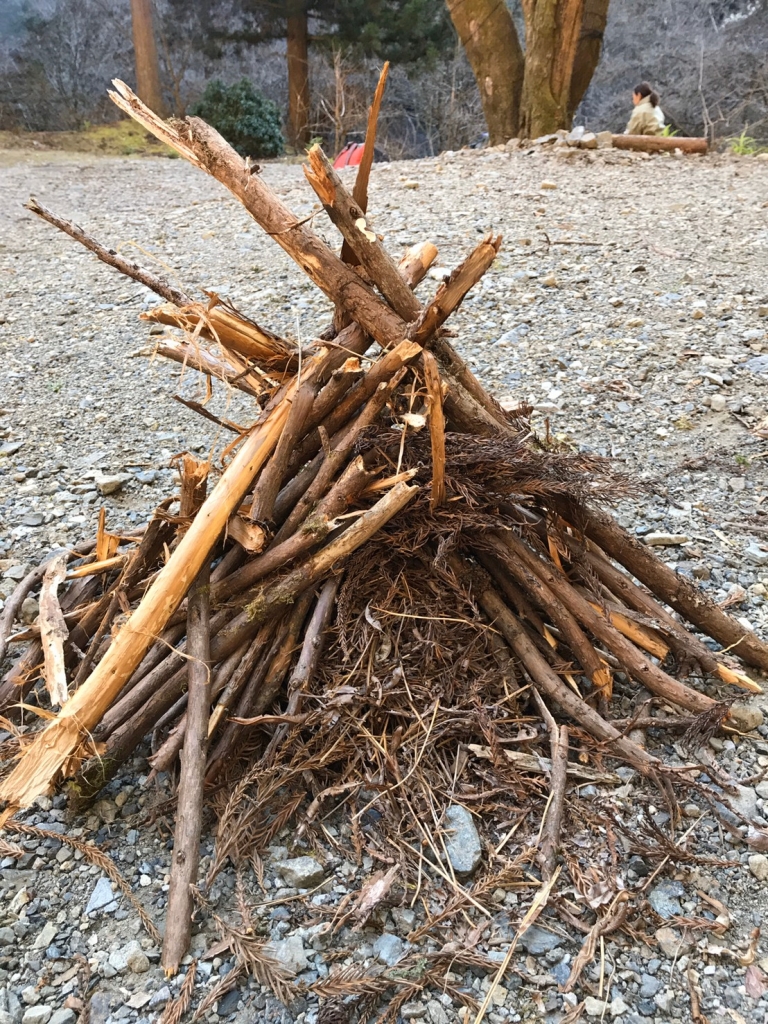 カマドや新聞紙などを使わず 現地の薪を拾い集め