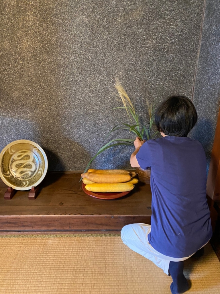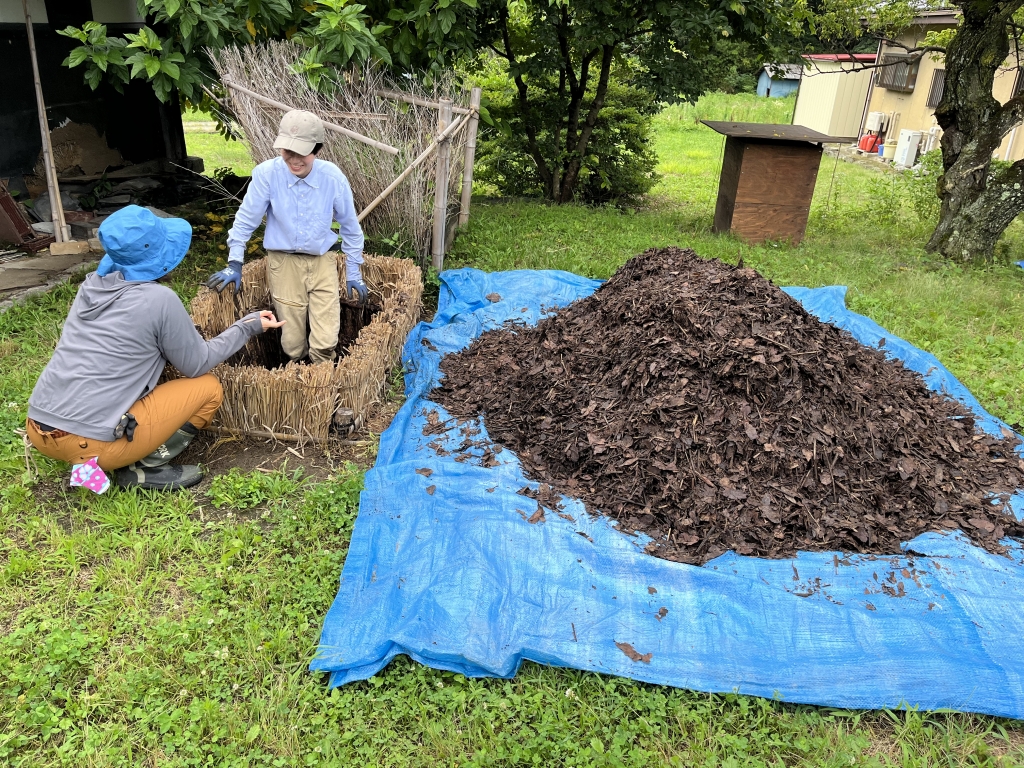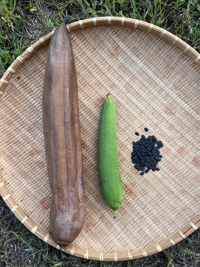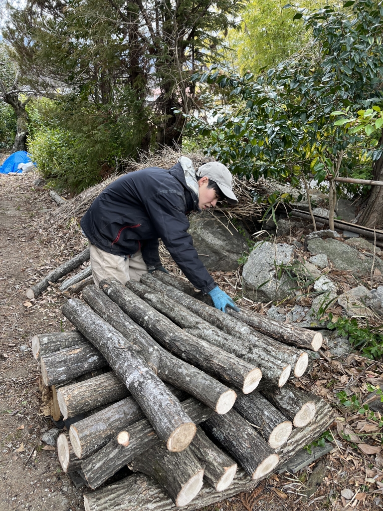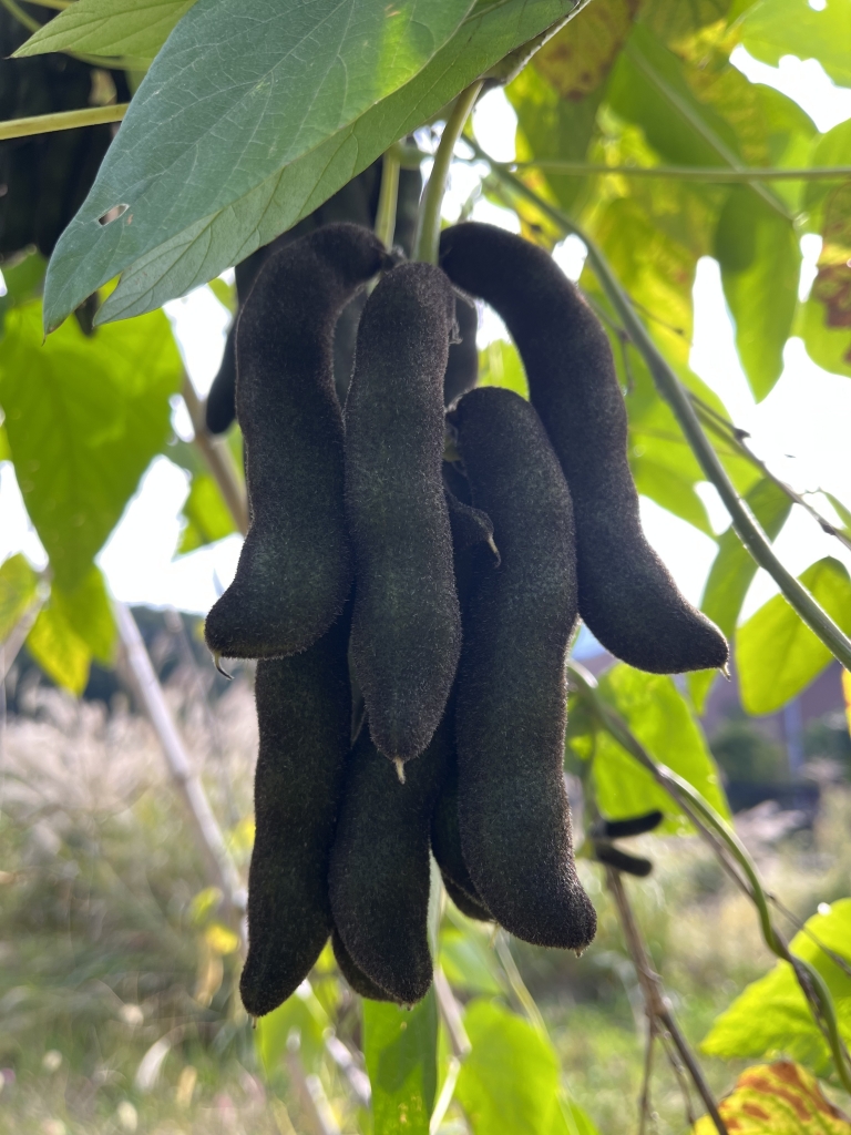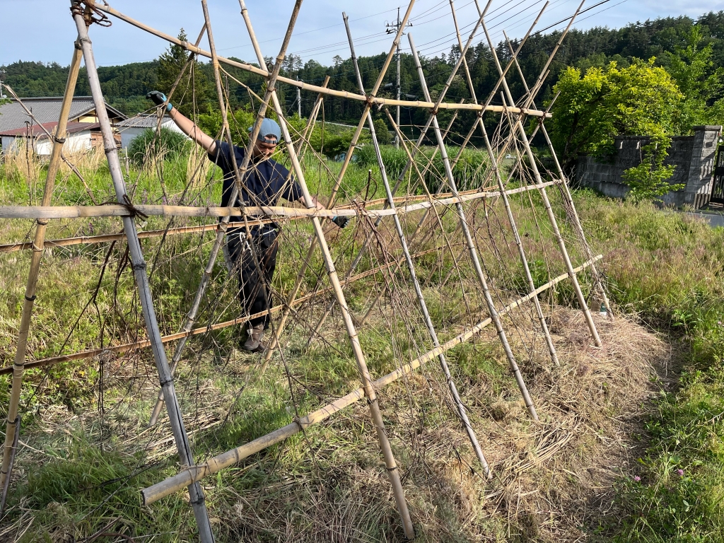 竹とモロヘイヤの枯れ枝で豆の支柱づくり