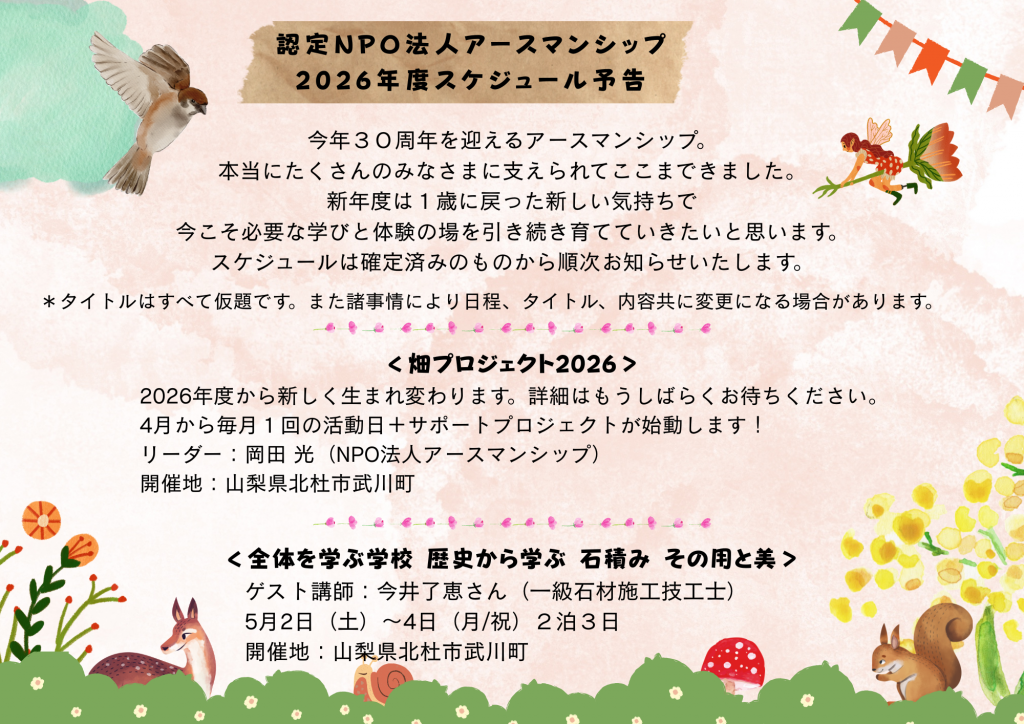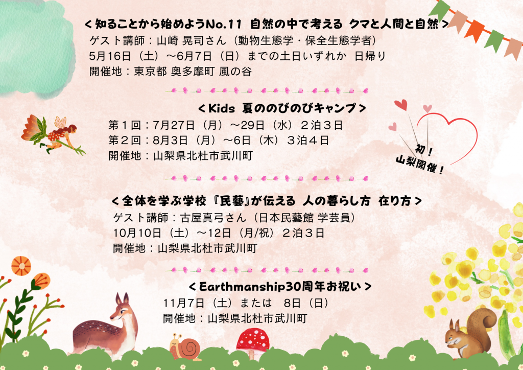 記事 よかったらシェアしてね! URL Copied! Earthmanship 畑プロジェクト2025(年度)ー次回は 2026/3/22(日) 関連記事 全体を学ぶ学校2023 第2回 古武術に学ぶ 身体の動きと全体性 2023.08.03 いのちの自然塾2024 レポート 2024.05.06 〜親子で楽しむ〜奥多摩デイキャンプ 2022.03.18 親と子の奥多摩デイキャンプ2025 レポート 2025.05.21 Earthmanship オープン・デー 2022.09.02 川の安全講座 〜知っておきたい 川の安全な楽しみ方〜 2022.06.06 Kids 夏の のびのびキャンプ 2023 2023.05.25 全体を学ぶ学校2024 未来への希望 小規模家族農業と酪農の世界 2024.08.01